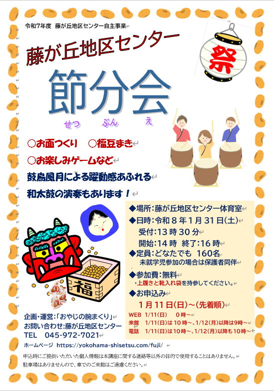 | 概要 | 藤が丘地区センターの体育室で開催される、豆をまいて鬼を 追い出す節分行事です。「お面づくり」や「お楽しみゲーム」なども あるほか、「鼓鳥風月」による和太鼓の演奏も予定しています。 |